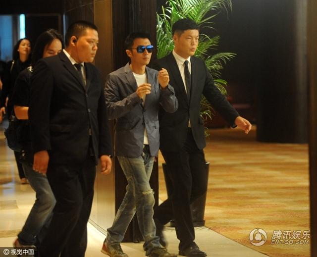 视觉中国2016年7月14日讯 上海,日前,谢霆锋在众多保镖及工作人员簇拥下出席活动,一路上霆锋做着眼保健操看上去很疲惫的样子,见到镜头霆锋马上带上墨镜快步走进会场。