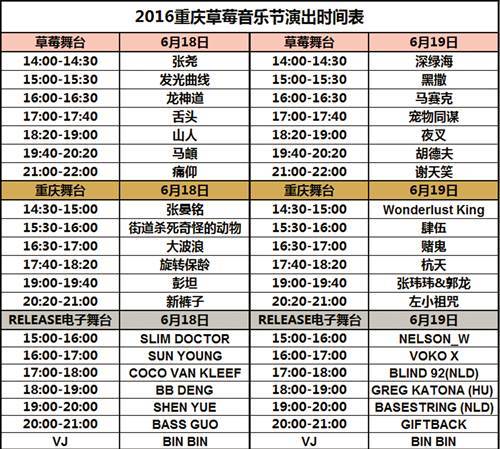 6月18日,重庆舞台压轴乐队为现今中国最耀眼、别具一格,也是最具冒险精神的偶像摇滚乐队——新裤子;6月19日,重庆舞台压轴乐队为当前中国极富思想性和影响力的摇滚明星左小祖咒。两支本土乐队张晏铭与Wonderlust King将作为首支发声乐队登上重庆舞台,彭坦、张玮玮&郭龙、旋转保龄、赌鬼、大波浪、肆伍也将逐一登台。